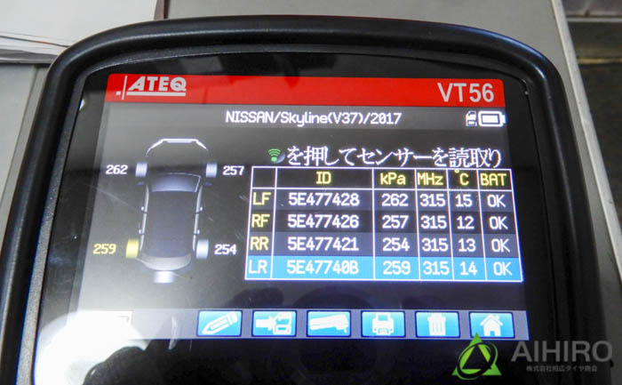 V37型スカイラインにはセンサーがTPMSセンサー(空気圧モニタリングセンサー)装着されています。